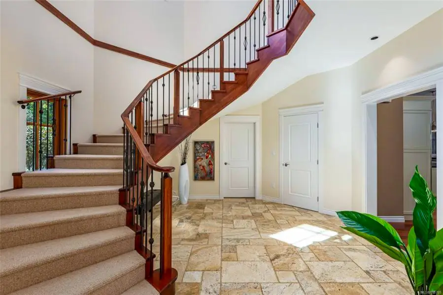 The striking wooden double doors serve as the focal point of the entryway. Their warm, natural wood finish adds a touch of rustic elegance and sets a welcoming tone for the home. The glass panels in the doors allow natural light to filter into the space, enhancing its brightness and openness. Overall, the entryway design combines classic and elegant elements, creating a warm and inviting space that sets the tone for the rest of the home. The use of high-quality materials and thoughtful architectural details reflects the client's commitment to creating a timeless and welcoming environment.